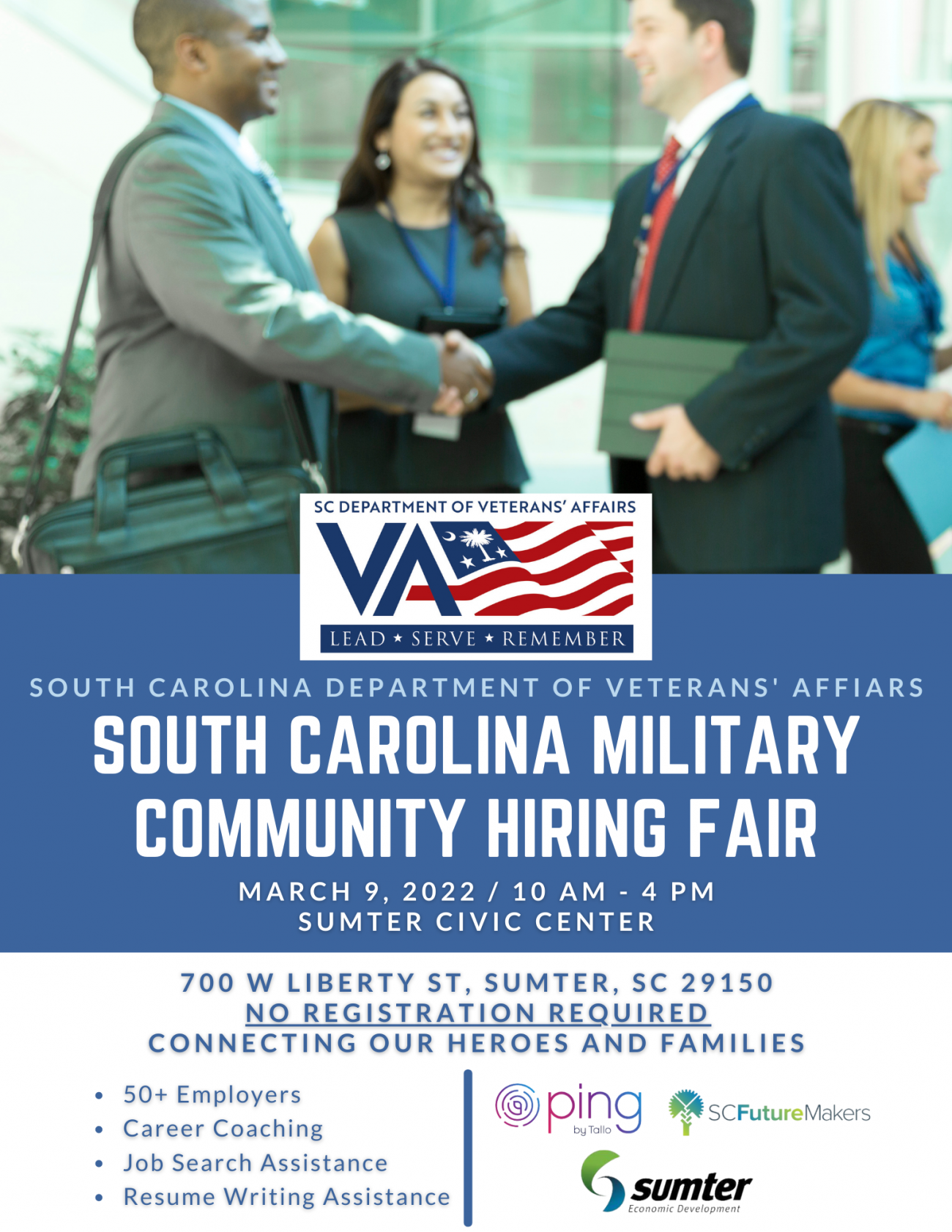 The South Carolina Department of Veterans’ Affairs has partnered with Ping by Tallo, SC Future Makers, and Sumter Economic Development to host the first South Carolina Military Community Hiring